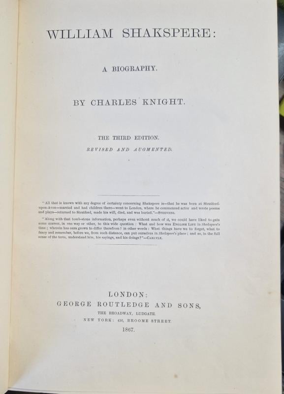 Third edition of, revised and augmented of the biography, second edition of the plays. Illustrated, some shelf wear to the board edges and the occasional mark to the pages, top edges gilt, some light foxing to the tanned page edges. 2 vols of comedies, 2 histories, 2 tragedies & poems, a biography and a volume of doubtful plays etc. School prize plate loosely inserted. Shipped from the UK in recyclable card packaging.